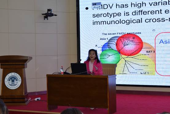 袁沅教授作了“Nonlinear Dynamics in Modeling Sea Lice with Stage Structure”的学术报告。她首先结合中国大陆养殖牛羊等牲畜的情况,概述了牲畜感染和传播口蹄疫的基本情况;接着,介绍了口蹄疫传播模型的建模过程,以及模型定性分析与数值模拟。