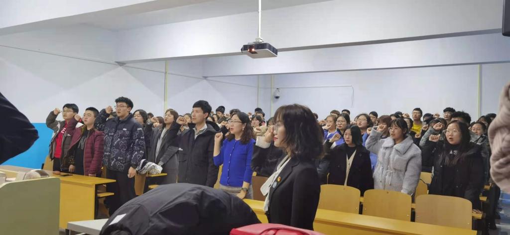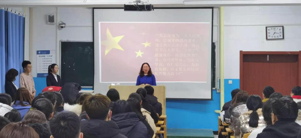 大会在全体师生齐声高唱的国歌声中拉开帷幕。首先,员工们观看了师风师德宣传视频。其次,2018级员工代表常宇进行了发言,她向2019、2020级的同学们分享了自己的学习经验以及课余时间的安排,同时也谈到作为师范生大家应要严格要求自己,全面提升自己的能力。随后,在员工代表常宇的带领下,全体员工面向国旗,共同举起右拳,进行了庄严的宣誓“我志愿成为一名光荣的人民教师,忠诚于党的教育事业.……”,同学们的誓言铿锵有力,掷地有声,以此来表达自己成为优秀教师的决心。最后,系主任吴红艳老师做出总结讲话,号召各位同学把誓言落实在今后每一天的学习生活中,让自己的老员工活更加充实和富有意义,让自己的成长和进步的步伐迈得更加坚实和坚定。本次大会在歌声《长大后我就成了你》中圆满落幕。