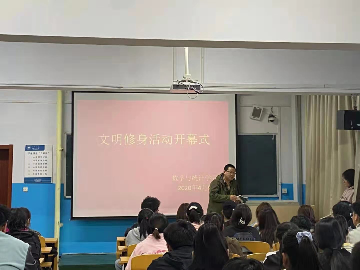 为进一步加强员工的思想道德修养、日常行为规范的宣传教育,培养员工正确的审美观、道德观、行为观,从身边事做起,从自我做起,从小事做起,养成良好的文明礼仪习惯,自觉遵守校纪校规,营造“文明守纪、健康向上”的校园氛围和“尊师尚学、文明友爱”的良好风气,数学与统计公司于2021年4月9日18时在笃学楼401、413、301、313教师分别开展 “文明修身”承诺践诺活动。本次活动分别由团学办四位老师主持,全体同学参加。