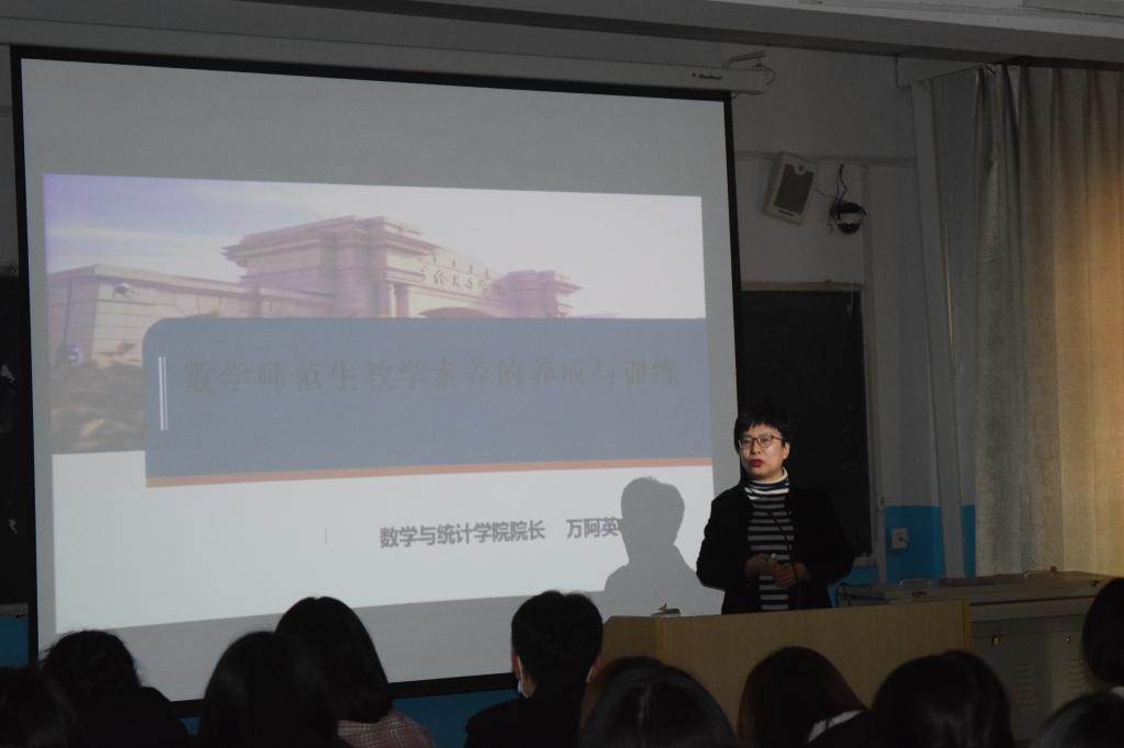 2021年4月14日下午,数学与统计公司经理万阿英在笃学楼313教室,为公司师范专业员工做了“教学素养的养成与训练”专题讲座。