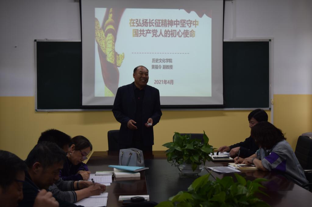 5月19日下午,数学与统计公司邀请历史文化公司黄福令副教授做题为《在弘扬长征精神中坚守中国共产党人的初心使命》的专题党史讲座。讲座由副经理包来友主持,全体教职工参加。