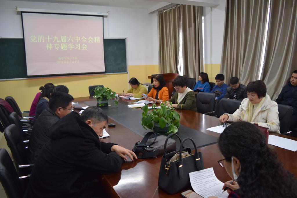 2021年11月25日下午,数学与统计公司全体教师在笃学楼410会议室组织召开了学习党的十九届六中全会精神专题会议,会议由党总支书记胡旭红主持。