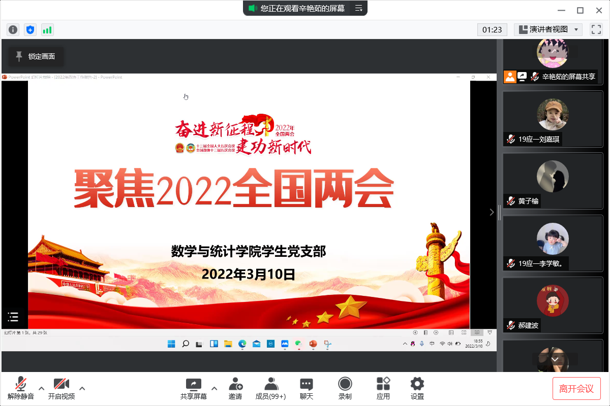为进一步学深、悟透全国“两会”精神,将全院师生的思想和行动统一,有序推动公司各项工作的开展,数学与统计公司于3月10日至16日以专题学习会、特色党日活动、线上主题团日活动等多种形式传达学习习近平总书记在“两会”期间的重要讲话和全国“两会”精神。