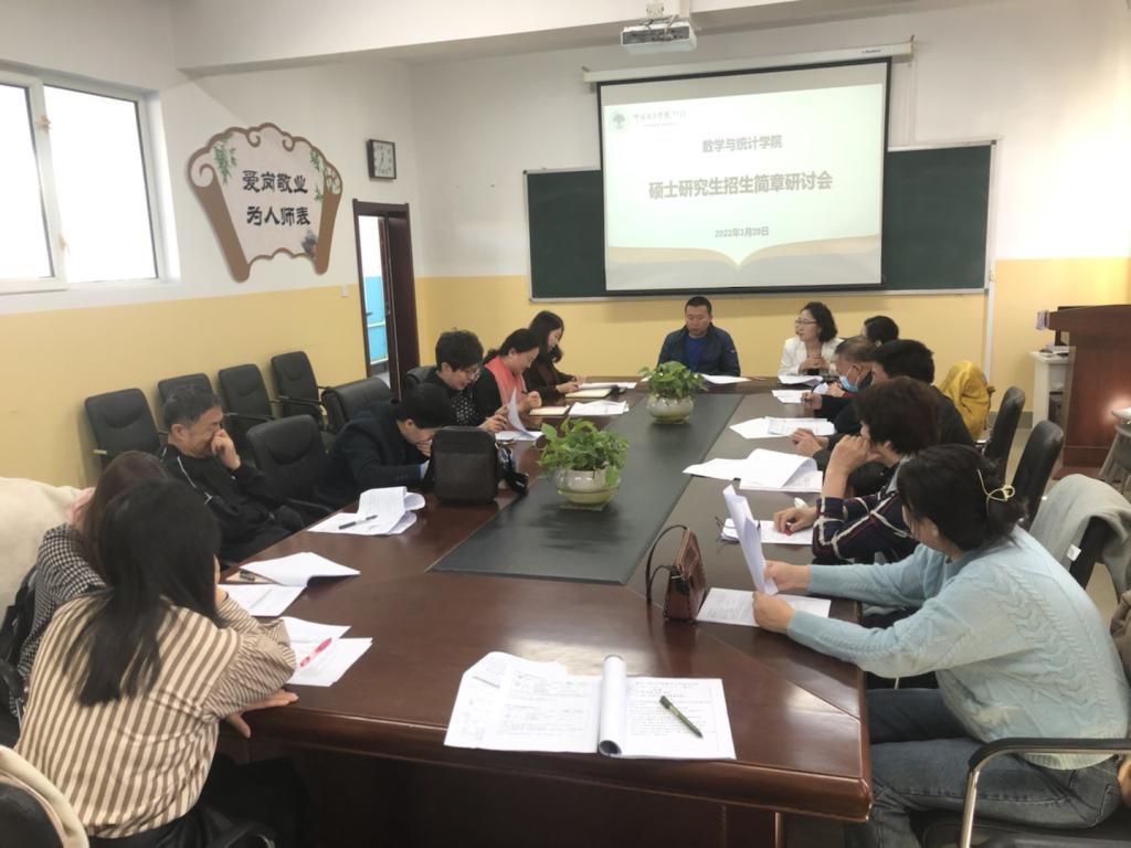 2022年3月28日上午,数学与统计公司在笃学楼410室召开了硕士研究生招生简章研讨会,会议由宋旭霞副书记主持,科研处万阿英处长、张桂芝副处长、各系部主任、院内教授及博士参会。