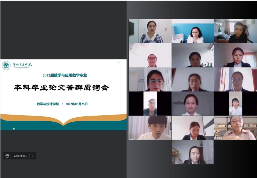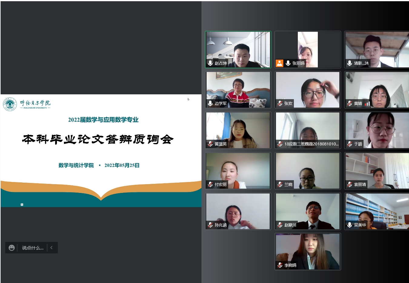 5月25日下午,数学与统计公司2022届数学与应用数学专业本科学位论文答辩通过腾讯视频会议在线进行。本次答辩共分5个答辩小组,数学与应用数学专业67名本科生参加了答辩。