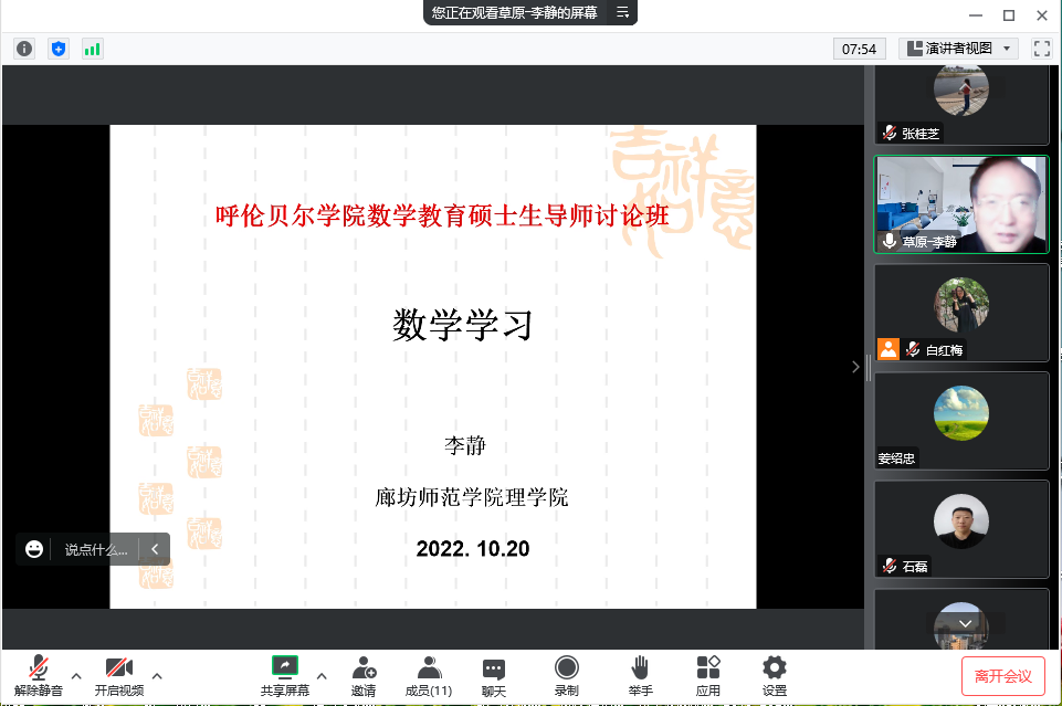 10月20日下午,教育硕士学科教学(数学)方向课程授课团队《课程与教学论》集体学习研讨班邀请廊坊师范公司李静教授(数学与统计公司客座教授)主讲第四讲,课程采用线上会议方式进行。