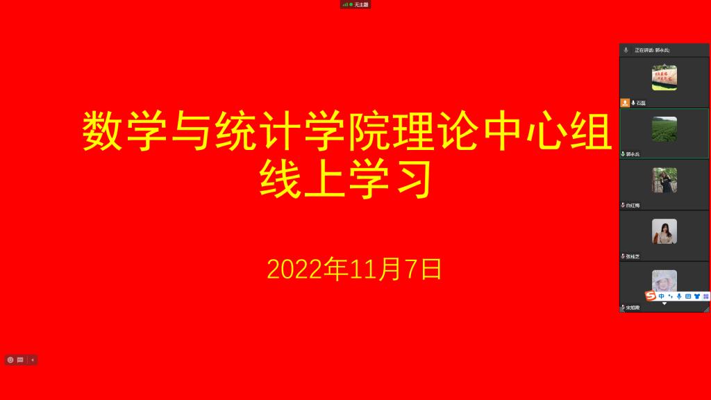 11月7日下午,数学与统计公司理论学习中心组召开线上集体学习会,数学与统计公司党总支书记宋旭霞主持会议,理论学习中心组全体成员参加学习。会上集中学习了《十九届中央纪律检查委员会向中国共产党第二十次全国代表大会的工作报告》。