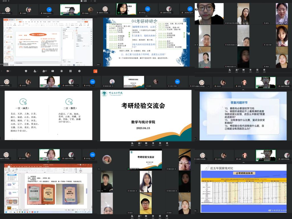 为帮助考研学子明确考研目标,鼓舞考研斗志,掌握学习方法与技巧,做好考研复习规划,4月15日晚,数学与统计公司举办线上考研经验交流会,邀请2018级、2019级4名毕业生分享考研成功经验和心得体会。会议由数学与应用数学系主任吴红艳主持,百余名员工参加了交流会。