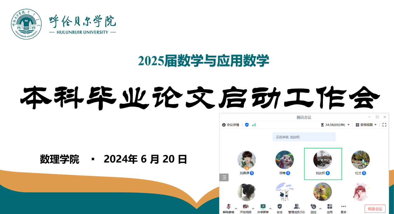 为了保证毕业论文开题工作的顺利开展,6月20日晚,伟德召开了2025届数学与应用数学专业毕业论文工作启动会(腾讯会议),公司副经理红兰、基础数学系主任项楠、实训实验室主任刘达权、刘昌源老师以及2021级数学与应用数学专业全体员工参加了会议。